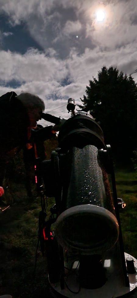 Bei Einbruch der Dunkelheit sah es durchwachsen aus. Mond und Jupiter waren in Wolkenlücken zu sehen. Doch dann zog es zu und es begann zu regnen. Die Wettervorhersage kündigte jedoch rechtzeitig vor dem Eintritt in den Kernschatten Wolkenlücken an. Die Zeit bis dahin wurde mit Gesprächen bei Glühwein im Vereinsheim verbracht.