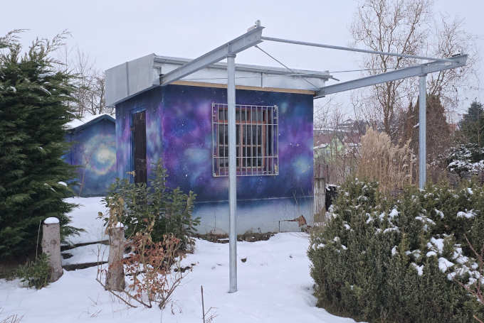 Seit Frühling 2022 gibt es in der Gartenanlage Einheit den Sternengarten. Beobachtet wird mit Dobsons auf der Wiese. Die Dobsons werden auch häufig bei Veranstaltungen am Vereinsheim eingesetzt. Zwischendurch schwebte auch immer die Idee, die Gartenlaube in eine Sternwarte umzubauen. Dieses Projekt stieß auf Unterstützung des Vereinsvorstandes, insbesondere der Vorsitzenden Grit Martinez. Am Nachmittag vor der Beobachtung zum Astronomietag am 28.10.2023 gab es ein Brainstorming, an dem sich neben Mitgliedern von Astronomieverein und Gartenverein auch Künstler*innen beteiligten. Grit gelang es dann, Anfang 2024 Fördermittel aus dem TRAFO-Programm zu beschaffen und die Firma Kohlbach wurde mit dem Bau einer Metallkonstruktion für ein abfahrbares Dach beauftragt.